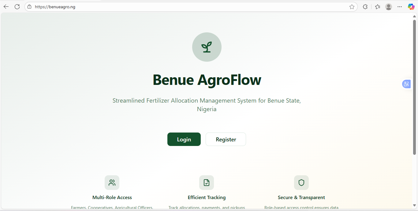 Benue AgroFlow is an agricultural management system that serves multiple stakeholders including Farmers, Cooperatives, Agricultural Officers, Payment Officers, and Administrators. The platform enables efficient tracking of allocations, payments, and pickups through unique allocation codes, ensuring complete traceability of agricultural resources and transactions.